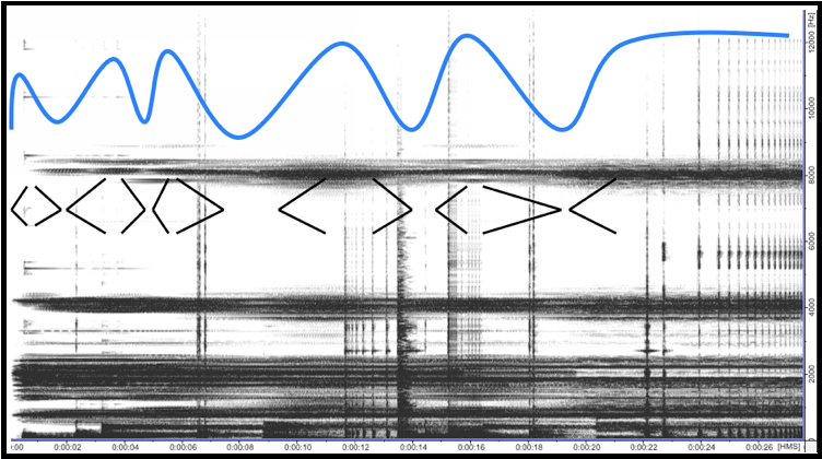 The image on the right shows arborescent temporal structures in the composition. Arborescences grow from one source-stream, and gradually disappear or transform into a different kind of organisation. The thickness of arborescences indicates spectromorphological complexity of streams that constitute corresponding timescales. Part of the sound undergoes a rhythmic development (dark areas), while another part demonstrates a more fluid, non-discrete motion (light grey areas).